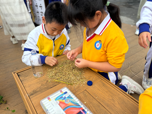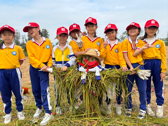 收獲的稻谷成為創(chuàng)意素材。同學(xué)們將金黃谷粒裝入透明瓶,貼上節(jié)氣貼紙、系上彩繩,制作成獨一無二的節(jié)氣手作;隨后分組搭建骨架、捆綁稻草、繪制笑臉,一個個憨態(tài)可掬的稻草人佇立田間,成為守護稻田的“創(chuàng)意使者”,在動手實踐中鍛煉了耐心與專注力。