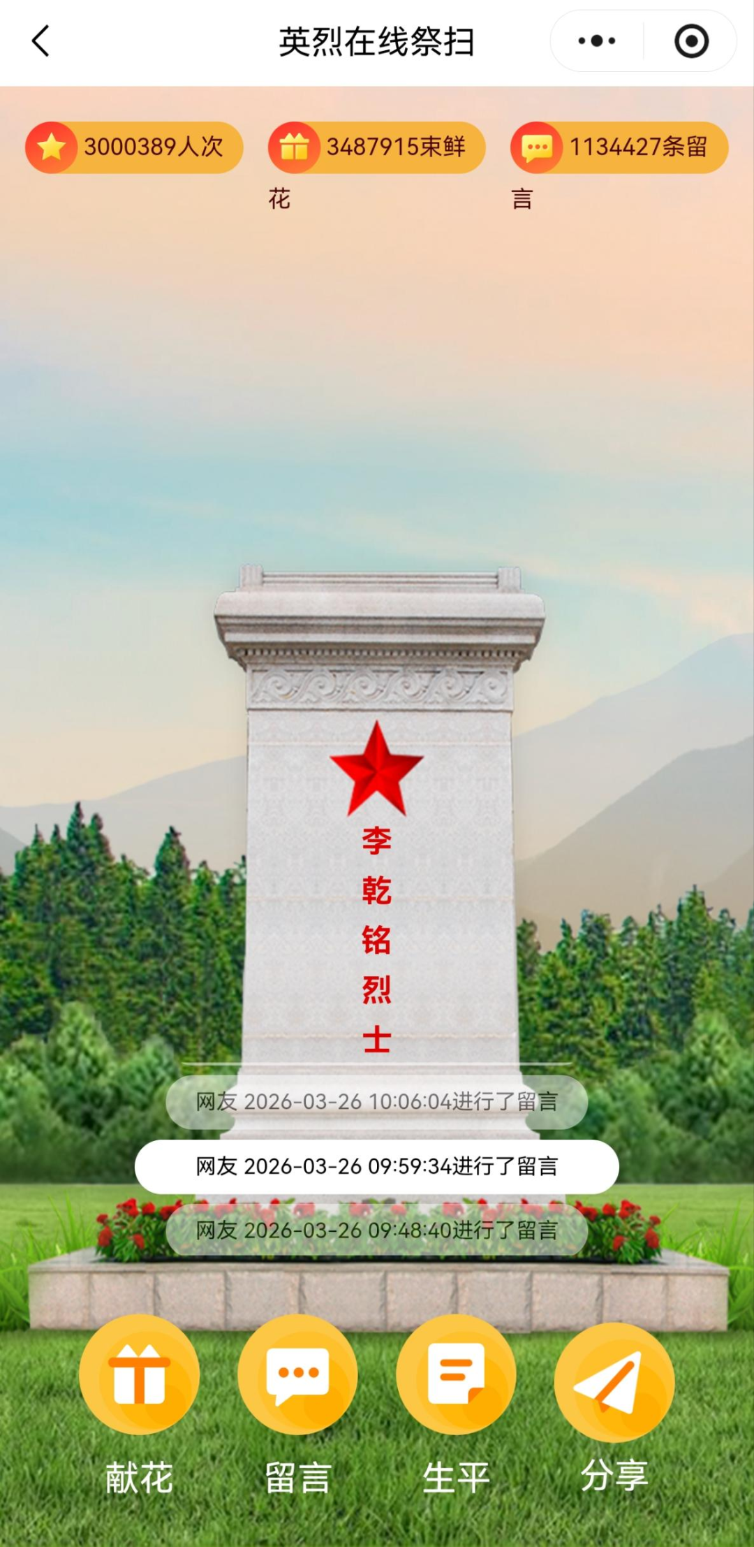4、烈士名錄中選擇其中一烈士,點(diǎn)擊留言。