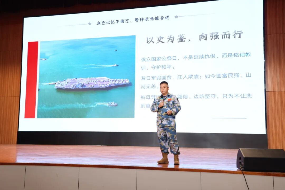 活動邀請中山港口鎮(zhèn)人民武裝部副部長賀洪彪以《銘記歷史守海疆 青春立志報家國》為題開展專題講座,帶領(lǐng)師生重溫南京大屠殺那段山河破碎的屈辱歷史,闡釋國家公祭日的設(shè)立意義,讓師生深刻理解“銘記歷史、勿忘國恥”的意義。現(xiàn)場莊嚴肅穆,全體師生為南京大屠殺死難同胞默哀,用無聲的敬意寄托對逝者的哀思。 會上,賀洪彪結(jié)合自身十五載南沙守礁經(jīng)歷,講述“以礁為家、以苦為榮”的崢嶸歲月,用軍人的忠誠與信仰,詮釋新時代國防衛(wèi)士守護家國的責任擔當,讓師生們真切感受到和平生活的來之不易。