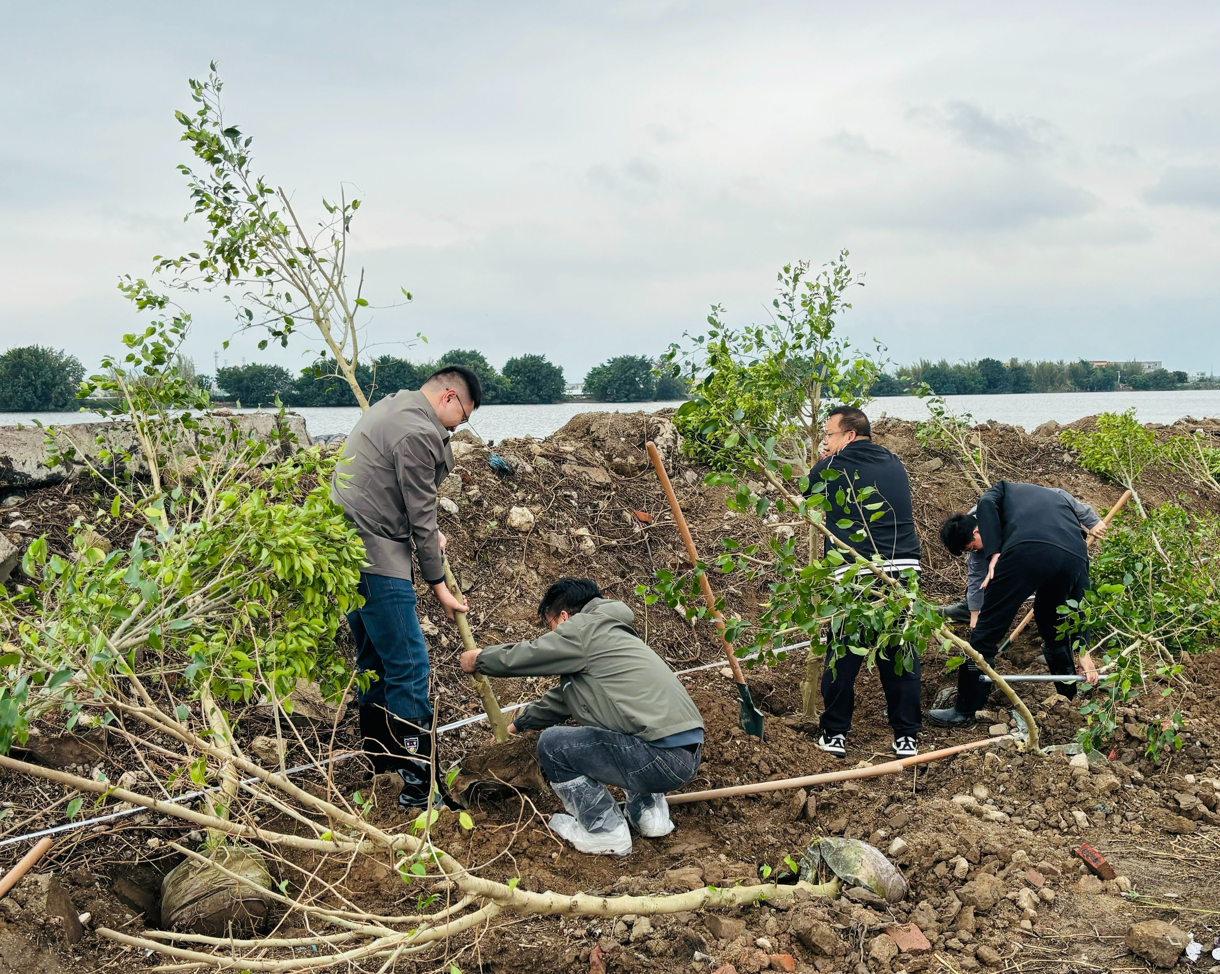 當(dāng)天下午3時(shí)30分,一眾黨員干部和社區(qū)志愿者早早來(lái)到北臺(tái)涌和石岐河交界處。大家三五人一組,揮鍬鏟土、扶苗填坑、提桶澆水,分工協(xié)作,干勁十足。不一會(huì)兒,垂葉榕、落羽杉等100多棵適宜親水環(huán)境的優(yōu)質(zhì)樹種在河岸兩邊“安家落戶”。這些新綠不僅能夠固土護(hù)坡、涵養(yǎng)水源,未來(lái)更將與清澈河水相映成趣,形成一道優(yōu)美的生態(tài)景觀廊道?!霸?jīng)這里又臟又臭,讓人不敢靠近?,F(xiàn)在黨委、政府把河涌治理好了,我們住在附近的街坊,也要出一份力,將兩岸風(fēng)景打扮得更漂亮。”社區(qū)志愿者李先生如是說(shuō)。