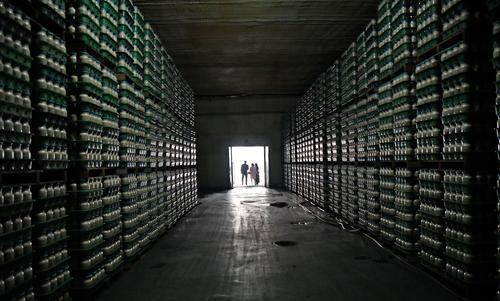 培育房中,一瓶瓶塑料瓶培養(yǎng)基被碼成兩個長長的矩形,在這里要經(jīng)過28天的培育,再通過搔菌組工人用機器自動化洗菌,挑選出不合格的培養(yǎng)基。經(jīng)挑選,培養(yǎng)基便“乘坐”傳輸帶,傳送至庫房。