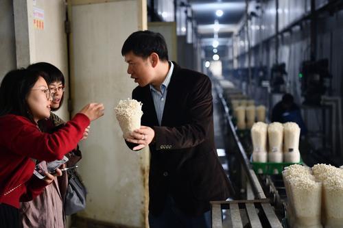 在庫房,記者看到,小小的金針菇剛剛“破土而出”冒出點點嫩芽。整個庫房全部密封,霧氣繚繞,像置身于夢幻森林一般。公司董事長賴亞平介紹,庫房的空氣、水分、溫度都按供港澳蔬菜種植標(biāo)準(zhǔn)嚴(yán)格把控?!耙驗樯L過程干凈,生吃都可以。”他說著隨手取下傳輸帶上的金針菇,撕下一塊直接放進嘴里,并邀請我們品嘗。