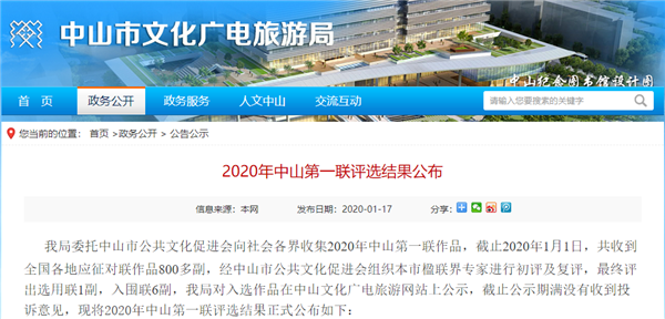 今日,中山市文化廣電旅游局公布了2020年中山第一聯(lián)評(píng)選結(jié)果。據(jù)了解,征集期間共收到全國(guó)各地應(yīng)征對(duì)聯(lián)作品800多副,經(jīng)中山市公共文化促進(jìn)會(huì)組織本市楹聯(lián)界專(zhuān)家進(jìn)行初評(píng)及復(fù)評(píng),最終評(píng)出選用聯(lián)1副,入圍聯(lián)6副。