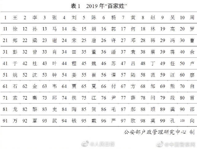 @人民日?qǐng)?bào) 1月20日消息,近日,公安部發(fā)布2019全國(guó)姓名報(bào)告,按戶籍人口數(shù)量排名,2019百家姓與2018相比略有變化。“王”“李”“張”“劉”“陳”依舊占據(jù)頭五把“交椅”?!叭f”姓以275萬人、“歐”姓以261萬人躋身2019百家姓?!俺!薄皽眱尚談t排至第101、102位?!鞍偌倚铡笨?cè)藬?shù)占全國(guó)戶籍人口的85.9%。