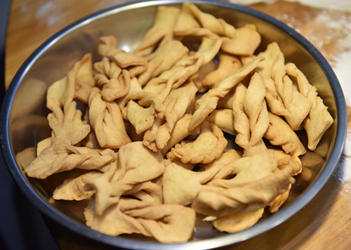 伴隨著廚房里傳出來(lái)的陣陣笑聲,角仔、煎堆、蛋散陸續(xù)出爐。團(tuán)聚、美食、笑聲,提醒在場(chǎng)的每個(gè)人,春節(jié)越來(lái)越近了。