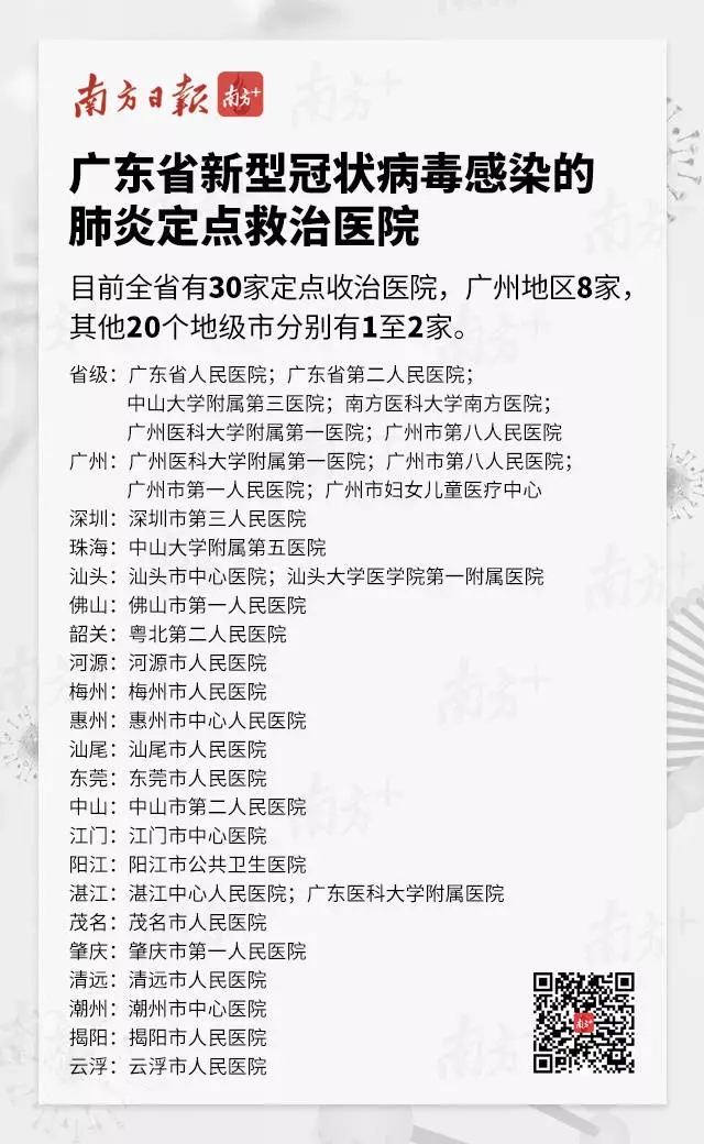 記者從發(fā)布會(huì)現(xiàn)場(chǎng)材料獲悉,目前全省有30家定點(diǎn)收治醫(yī)院,廣州地區(qū)8家,其他20個(gè)地級(jí)市分別有1至2家。如懷疑自己有疑似新型冠狀病毒感染的肺炎癥狀,可到以下醫(yī)院就醫(yī)↓