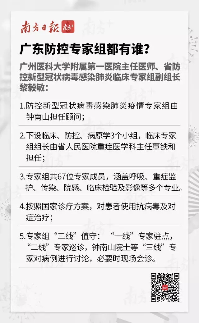省衛(wèi)生健康委成立了防控新型冠狀病毒感染肺炎疫情專家組,由鐘南山院士擔(dān)任顧問(wèn),下設(shè)臨床、防控、病原學(xué)3個(gè)專家小組,其中臨床專家組組長(zhǎng)由省人民醫(yī)院覃鐵和主任擔(dān)任,共有67位專家擔(dān)任成員,涵蓋呼吸、重癥監(jiān)護(hù)、傳染、院感、臨床檢驗(yàn)及影像等多個(gè)專業(yè)。