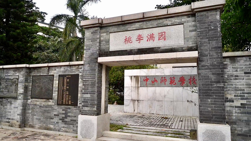 桃李滿園入門處,刻著學(xué)校沿革,從1913年香山縣立師范學(xué)校到2004年完成改制,每一次學(xué)校重大的歷史變更,都留下了印記。