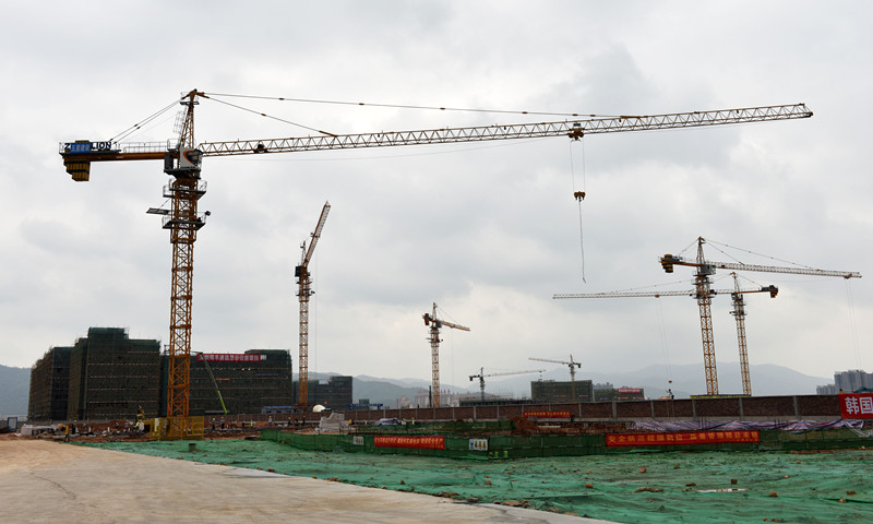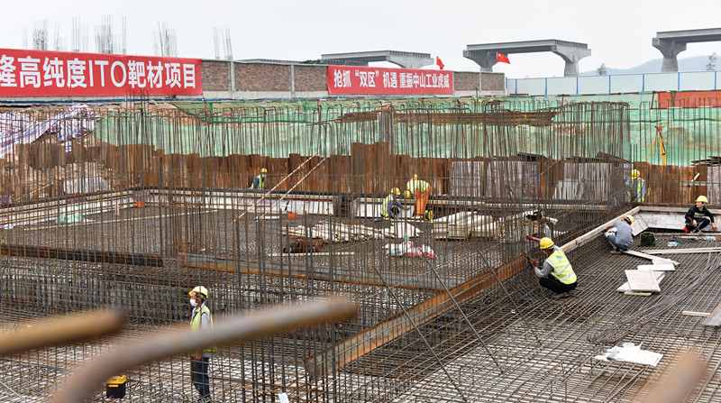 3月24日,在板芙鎮(zhèn)中山市智能制造裝備產(chǎn)業(yè)園“韓國智隆高純度ITO靶材研發(fā)生產(chǎn)項(xiàng)目”工地,4臺(tái)吊塔和兩臺(tái)吊車同時(shí)在工地上施工,“生產(chǎn)基地”鋼架結(jié)構(gòu)已搭建起來,“研發(fā)大樓”已完成地基工作。