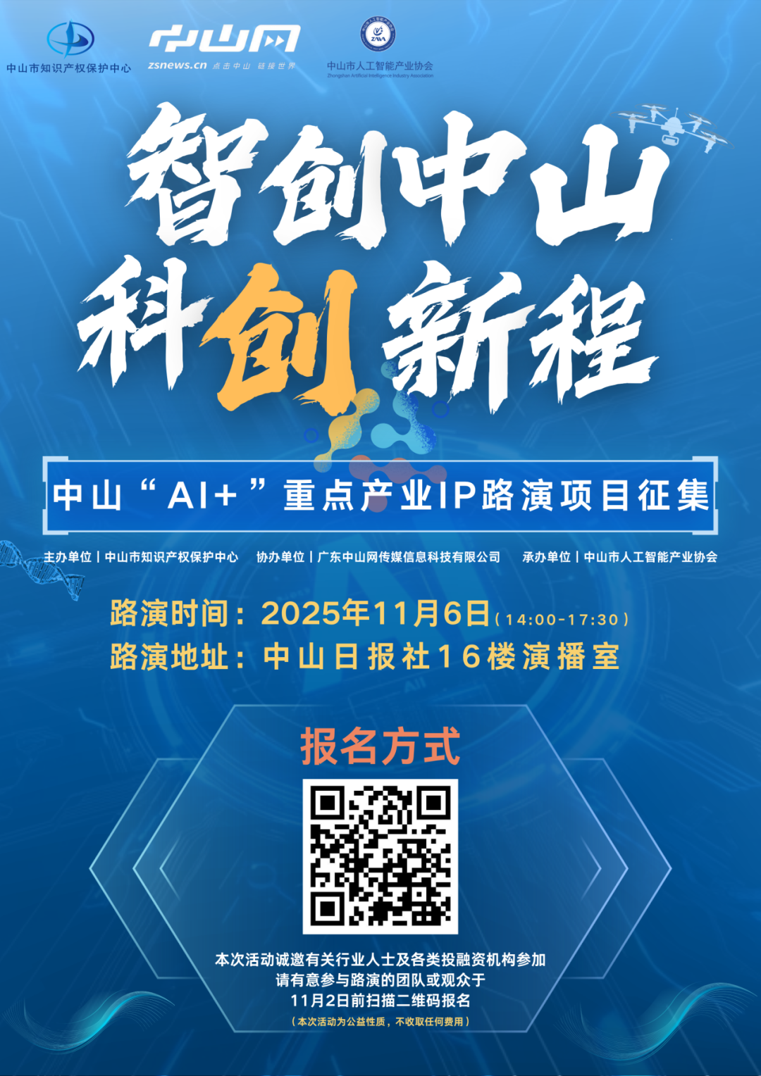 為助力我市加快培育壯大新興產業(yè)、前瞻布局未來產業(yè),推動企業(yè)技術需求與高校、科研院所專利成果精準對接,打通專利轉化關鍵環(huán)節(jié),進一步激發(fā)創(chuàng)新活力、拓寬產業(yè)融資渠道,中山市知識產權保護中心將于11月6日(周四)舉辦中山市“AI+”低空經濟、生物醫(yī)藥產業(yè)知識產權項目路演活動?,F面向全市各類創(chuàng)新主體,廣泛征集相關領域的知識產權路演項目。